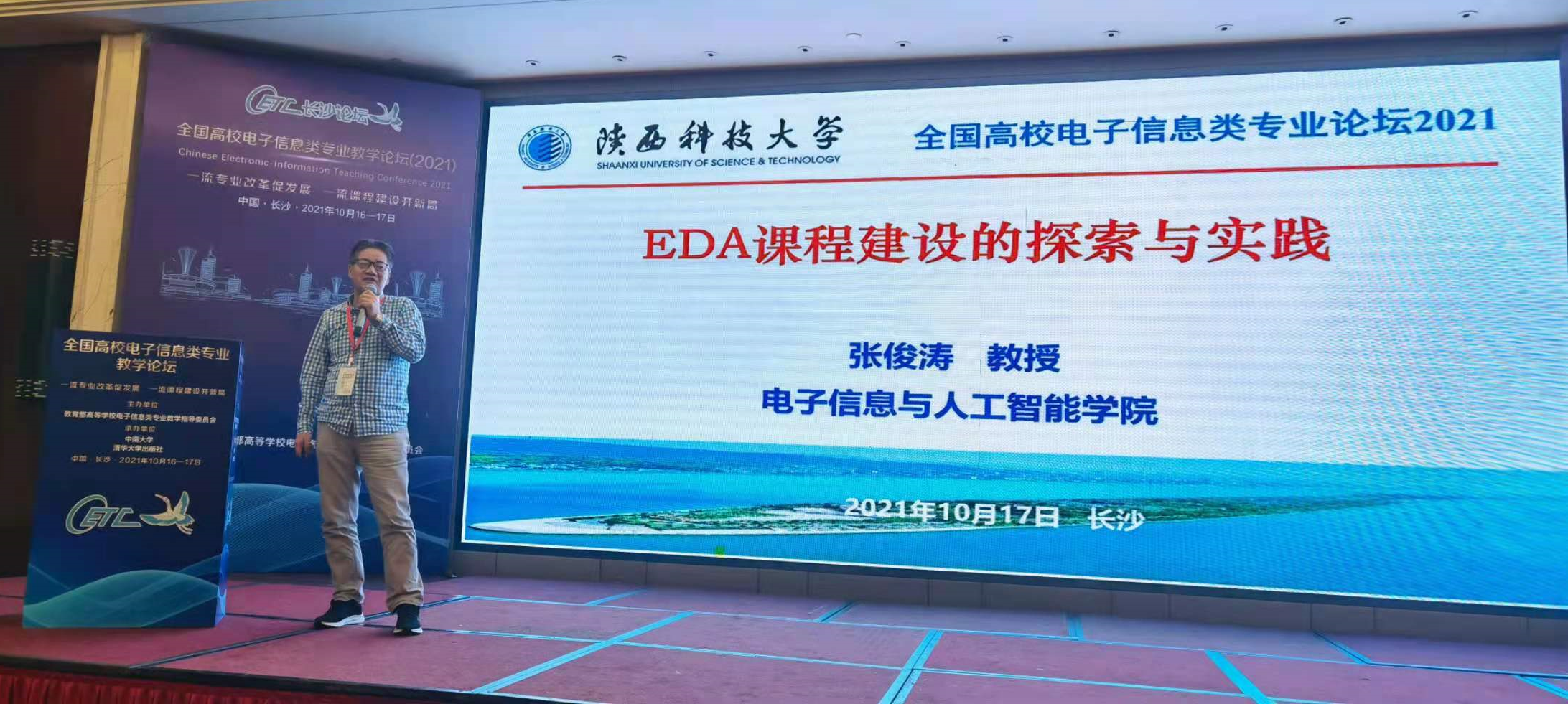 10月16日、17日,2021年全国高校电子信息类专业教学论坛在长沙召开,万象城官网电子信息与人工智能学院张俊涛教授受论坛会务组邀请,作为演讲嘉宾,在论坛上发表以“EDA课程建设的探索和实践”为主题的报告。